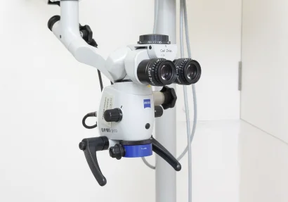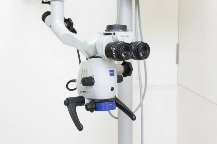 歯科診療、特に根管治療はミクロの世界を扱う繊細な作業の連続です。この細かい作業は今まで肉眼で、時には手探りで行われていたため、その精度には限界がありました。1990年代に入り、根管治療、特に外科的処置(根尖切除術)を、すでに脳外科・眼科・耳鼻科などで使用されている手術用顕微鏡下で行うことが始まり、その治療成績は飛躍的に向上しました。一般の根管治療においても、これまで見逃されていた根管、歯根破折の診断など明視野かつ拡大下で治療できるようになりました。 当院では複雑な歯根の歯に対し、手術用顕微鏡を用いてミクロの世界を明視野かつ拡大下で処置することにより、精度の高い歯科医療を皆様にご提供いたします。