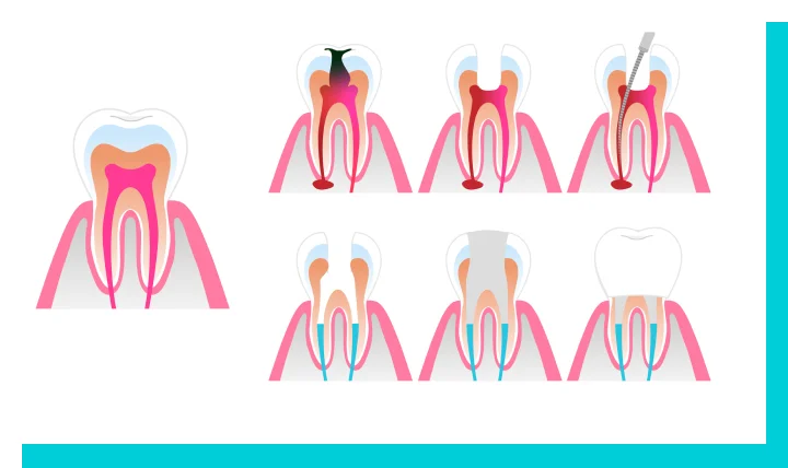 むし歯が進行すると、歯の根っこの根管内にある神経が炎症を起こして、強い痛みを伴うようになります。さらに、歯を支えている骨にまで悪影響が及んで、大事な歯を失うリスクもあります。こうした際には、「神経をとる治療」とも呼ばれ、根管内の神経や血管をきれいに取り除く根管治療が必要です。悪化すると、治療が難しくなるだけでなく、歯を残せないリスクもあるので、症状がある場合はできるだけ早くご相談ください。